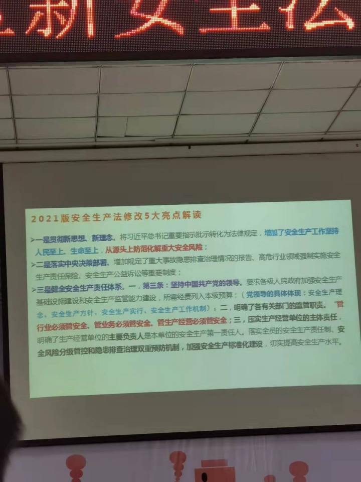 日開展新《安全生產(chǎn)法》知識(shí)專題培訓(xùn),進(jìn)一步宣傳貫徹新《安全生產(chǎn)法》的實(shí)施,有效落實(shí)安全生產(chǎn)職責(zé),提升安全生產(chǎn)防范意識(shí),有效防范和遏制安全生產(chǎn)事故發(fā)生。